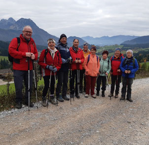 Foto links: die Wandergruppe v. l.: Albert, Elfi, Georg, Helene, Sophie, Traudi, Gerlinde, Franziska und Laura, im Hintergrund die Osterhorngruppe.