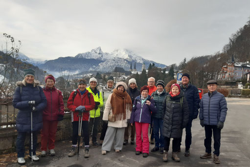 Foto links vl: Sophie, Traudi, Elfi, Margot, Herlinde, Susi, Rosi, Gerlinde, Irmin, Hermine, Laura, Christian und Peter mit dem schneebedeckten Watzmann im Hintergrund